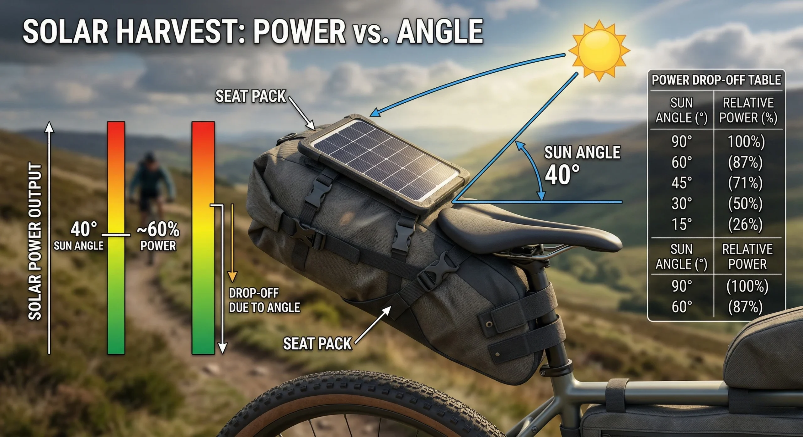 Solar generation for cyclists depends on “insolation”—the amount of solar radiation reaching the panel. Efficiency is highest when panels are perpendicular to the sun. For bikepackers, panels are often strapped to a Seat Pack or Handlebar Roll, meaning they operate at sub-optimal angles. High-efficiency monocrystalline cells are required to generate meaningful wattage in these variable conditions.