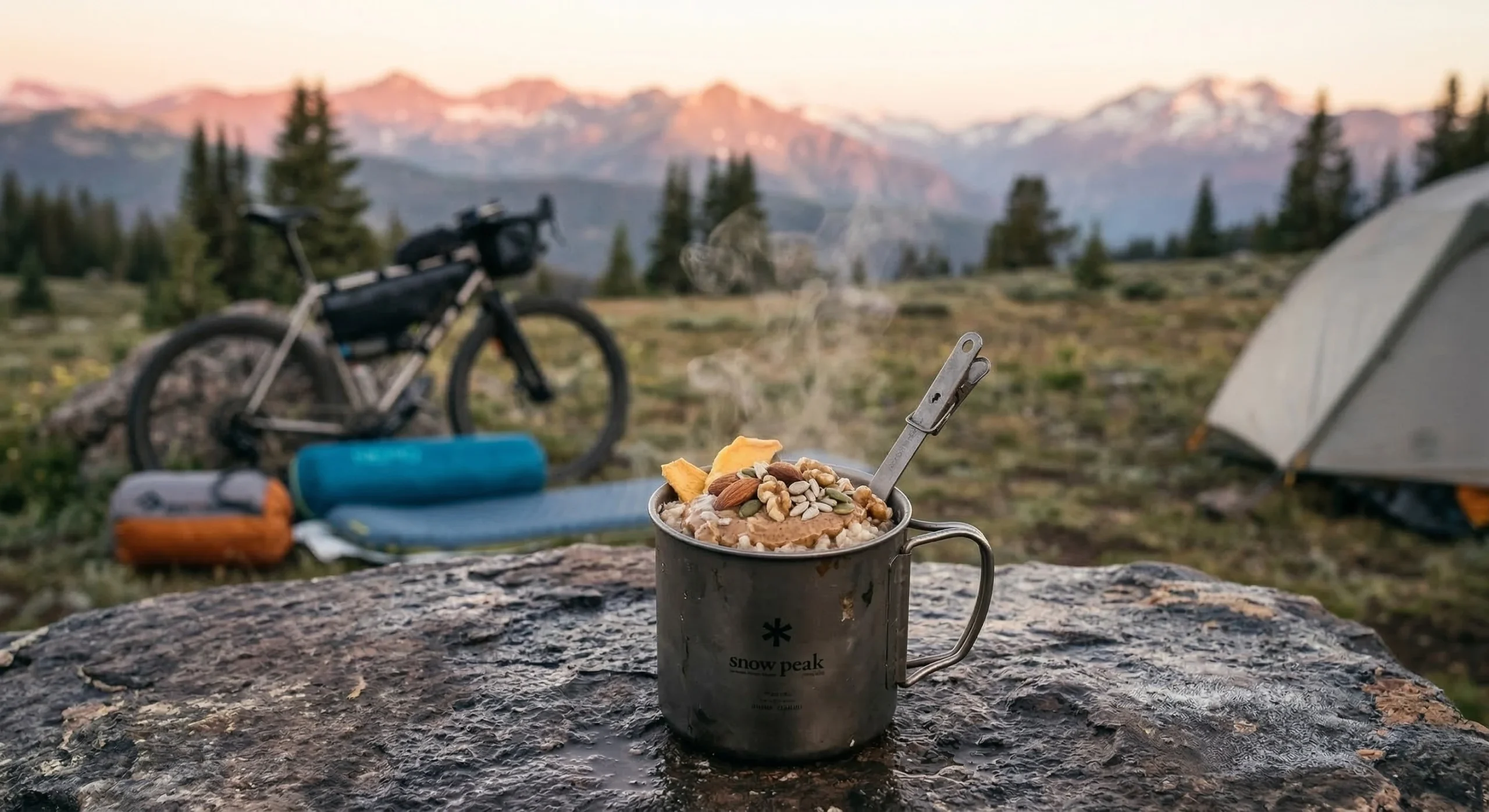 Titanium is the preferred material for bikepacking because of its high strength-to-weight ratio. Brands like Snow Peak offer minimalist mugs that serve as both a cooking pot and a drinking vessel.