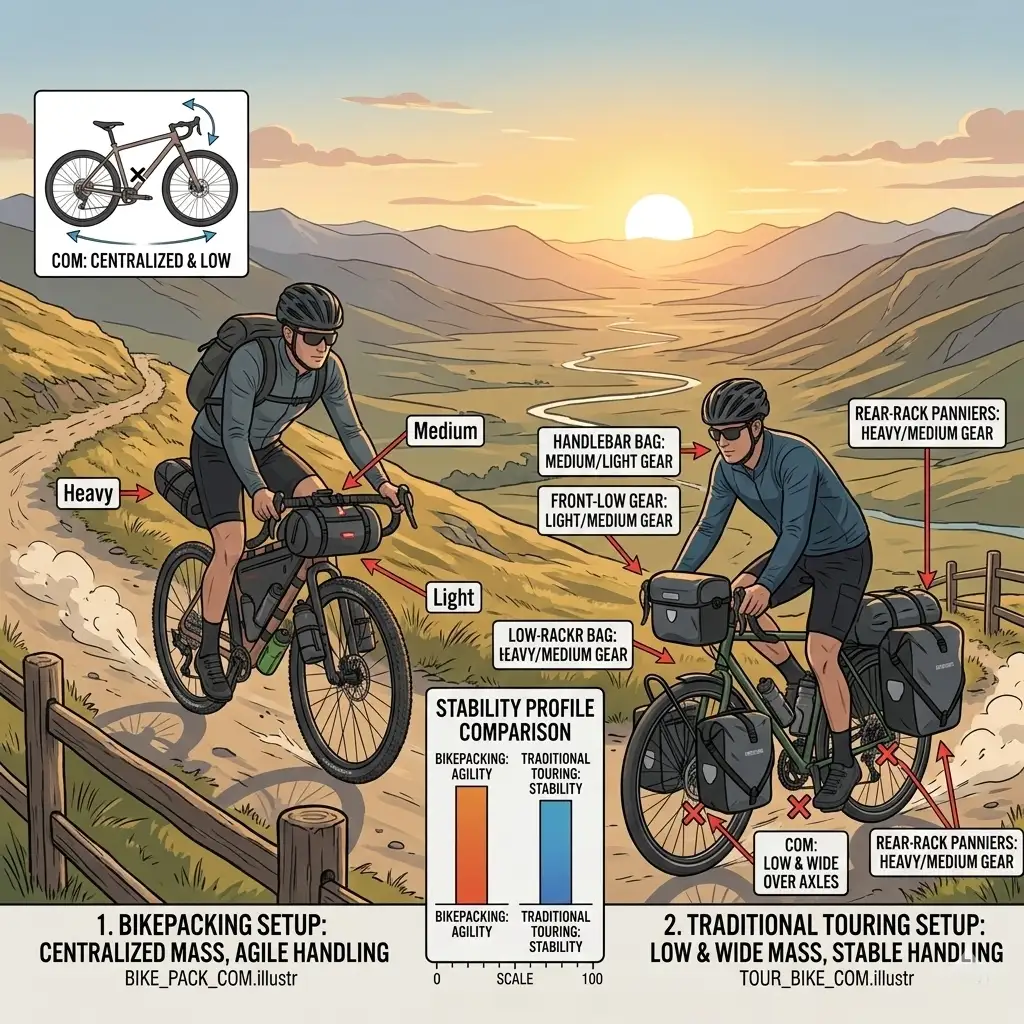 In cycle touring, the weight is typically carried low to the ground in front and rear panniers. This creates a very stable platform that tracks well on straight roads but makes the bike feel heavy and difficult to lean in corners. This “low-center” approach is explained in detail by the Bicycle Quarterly Technical Blog . Conversely, bikepacking weight is centralized and higher on the frame. This keeps the bike nimble and easier to lift over obstacles like fallen trees or boulders.