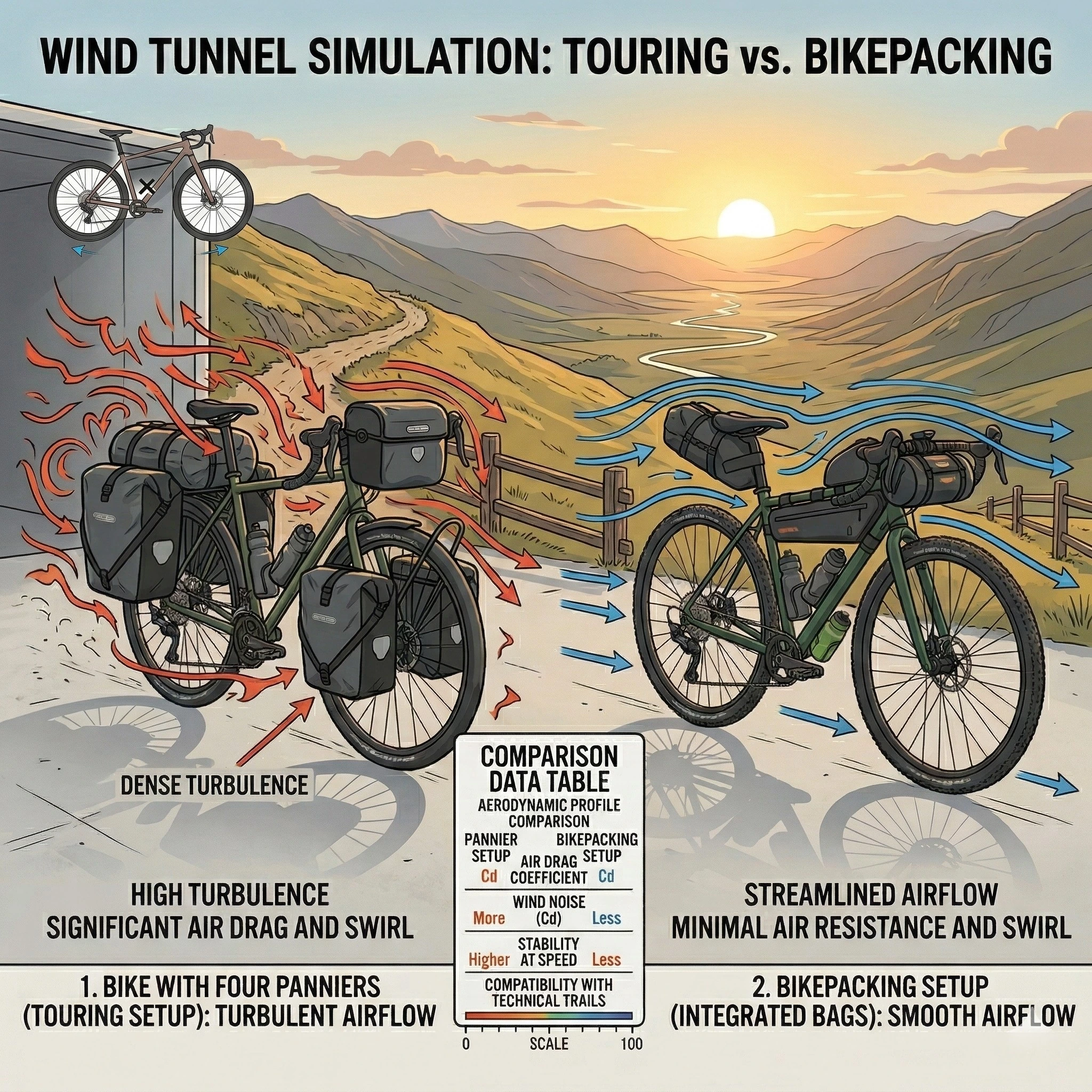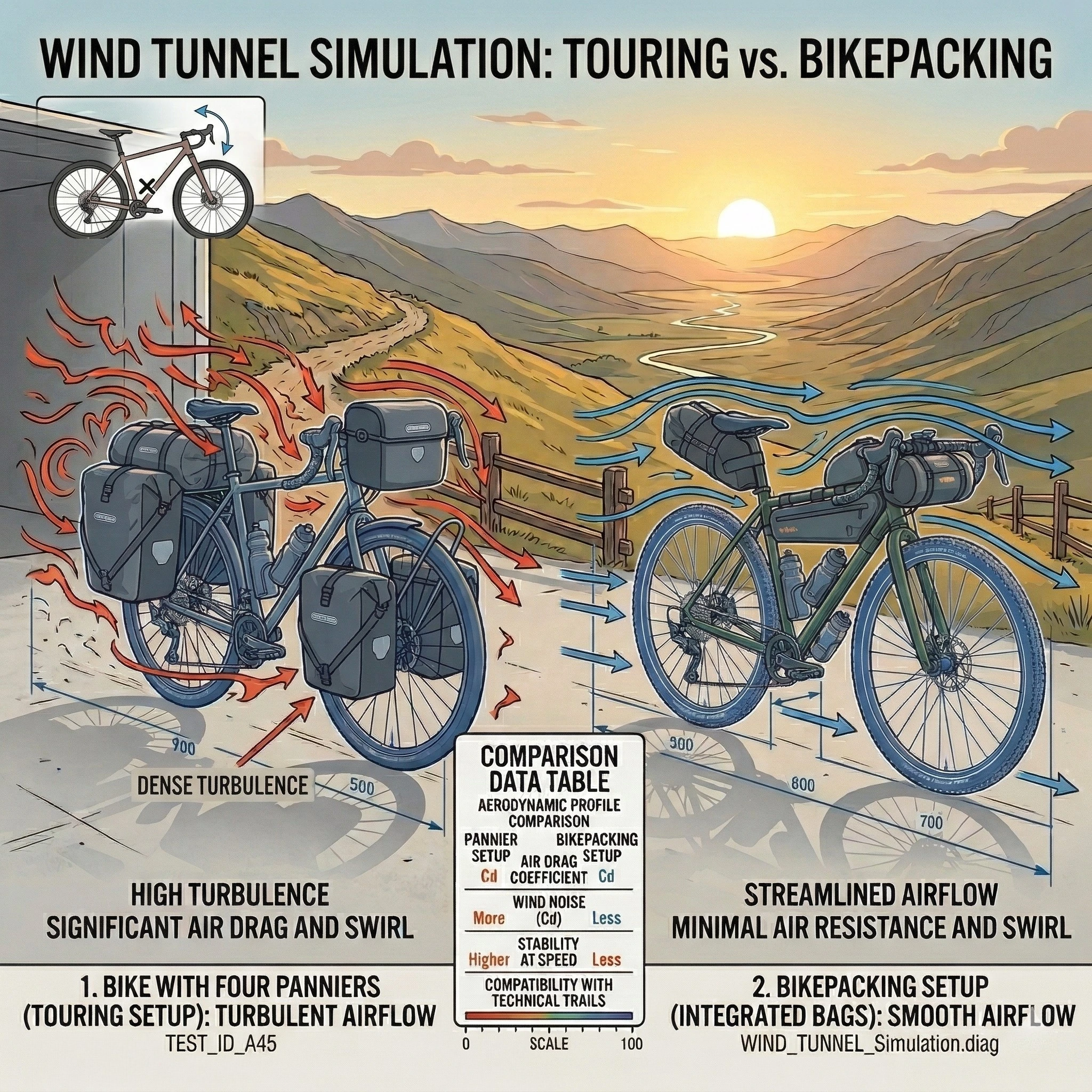 At road speeds, wind resistance is the primary obstacle for the cycle tourer. Large panniers act as air brakes, significantly increasing the energy required to maintain speed. The streamlined, “inline” nature of bikepacking bags reduces the frontal surface area, making the bike more aerodynamic. This energy efficiency is vital for riders following a Bikepacking 3-Day Plan where caloric conservation is key. For those interested in the math of cycling drag, the NASA Aerodynamics Guide provides the foundational physics of fluid dynamics.