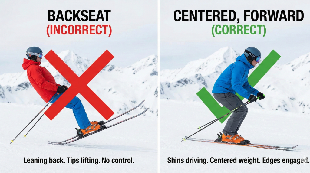 The most pervasive issue in skiing is the “backseat” posture where the skier leans back against the high-backs of the boots. This unweights the tips of the skis, making steering impossible and turning the thighs into burning brakes.