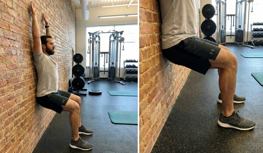 - Setup: Stand with your back to a wall, feet shoulder-width apart, and heels about 6 inches away from the baseboard.