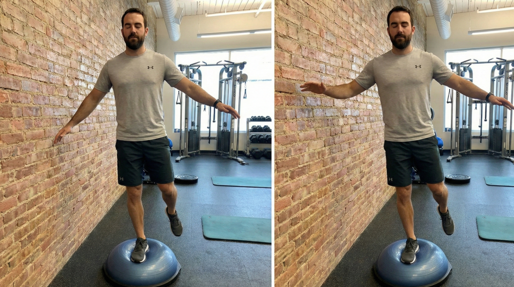 - Action: Stand on one leg with the knee slightly bent. Close your eyes.