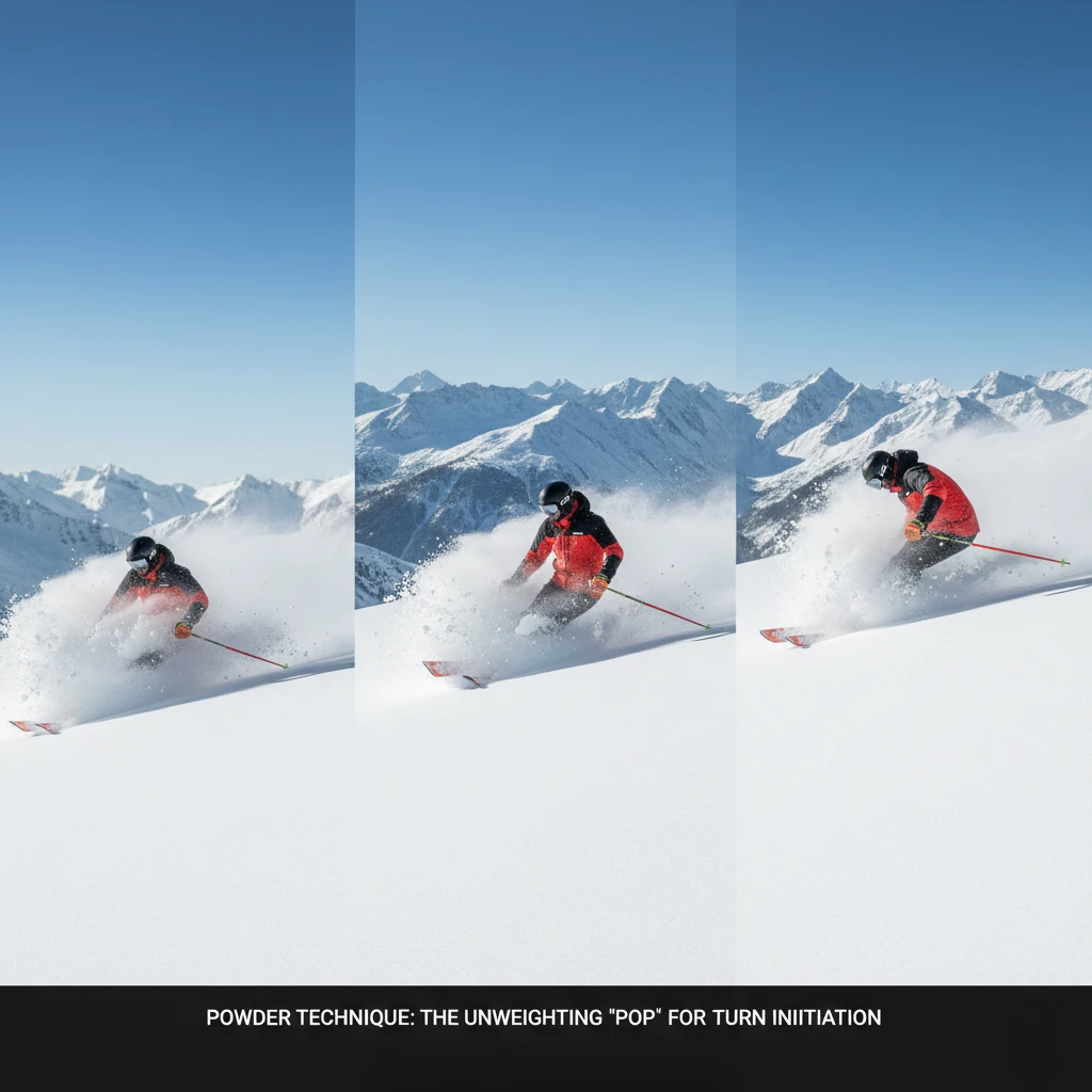 Turn initiation is fundamentally different when skiing in powder vs groomed runs. On hardpack, you can simply roll your ankles to engage the sidecut of the ski. In deep snow, the skis are effectively “locked” in place by the surrounding snow mass. You must create a moment of weightlessness to change direction.